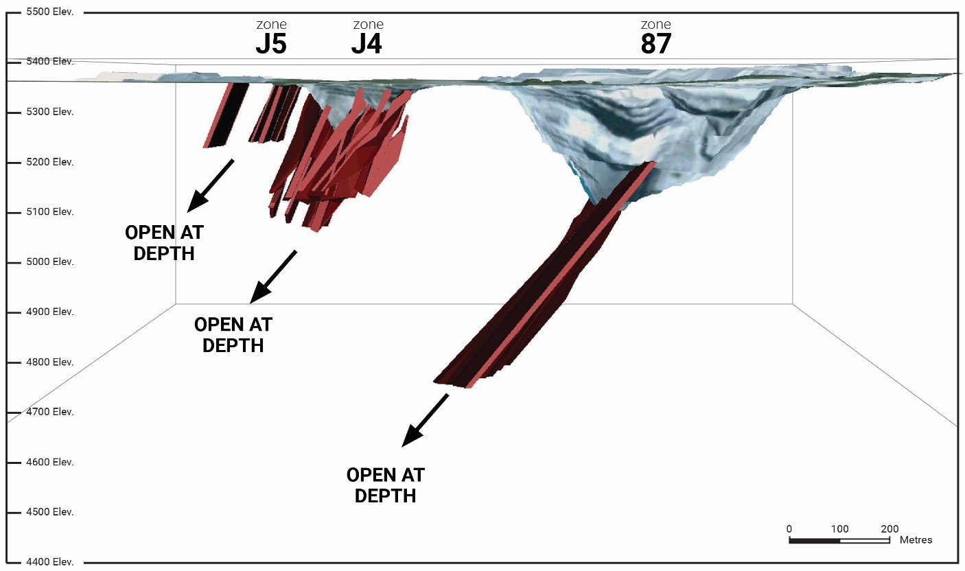 Image with caption: "Figure 1 – 3D Section of Troilus Zones 87, J4 and J5, Looking North (CNW Group/Sulliden Mining Capital)".